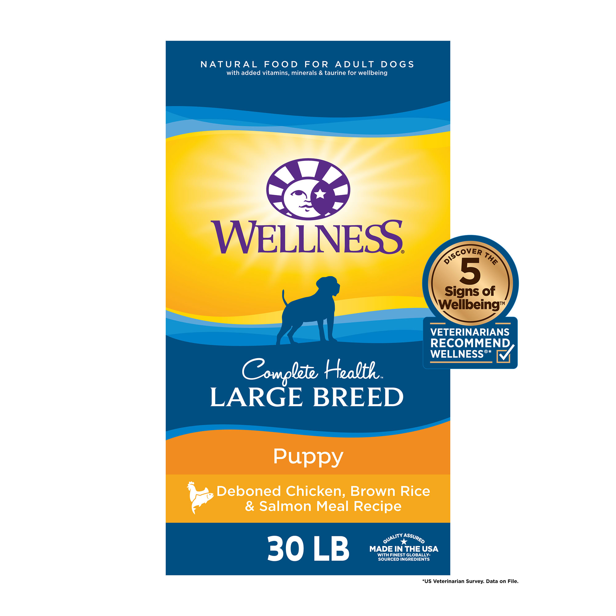 Wellness complete health large breed puppy deboned chicken brown rice salmon meal recipe dog food is formulated to meet the nutritional levels established by the aafco dog food nutrient profiles for growth and gestation lactation including growth of large size dogs 70 lbs or more as an adult.