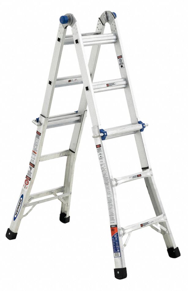 The werner multi position ladders can be easily transformed into multiple configurations to suit any job including twin stepladder stairway stepladder extension ladder and used as two scaffold bases.